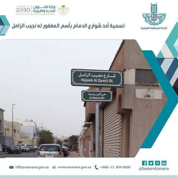 وأبان أن الاختيار وقع على الشارع الذي يقع بجانب منزل الفقيد نجيب الزامل بحي المزروعية بالدمام، حيث تم توجيه إدارة تسمية وترقيم الشوارع بالأمانة بسرعة تنفيذ توجيه أمير المنطقة، وتم استبدال لوحات الشارع بلوحات تحمل الاسم الجديد.